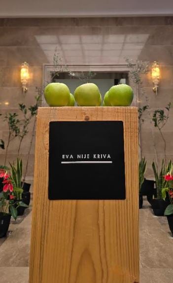 Centralni elementi instalacije -Jabuke i natpis “Eva nisu krivi” i “Adam, oprostio ti je”. Oni postavljaju: stara nametnuta slika svijeta, zaptivanje žena u politici, tradicionalni prirodni štitnici Isude, otvaranjem prostora za novo oprost od diskursa, pričest i transformacije.